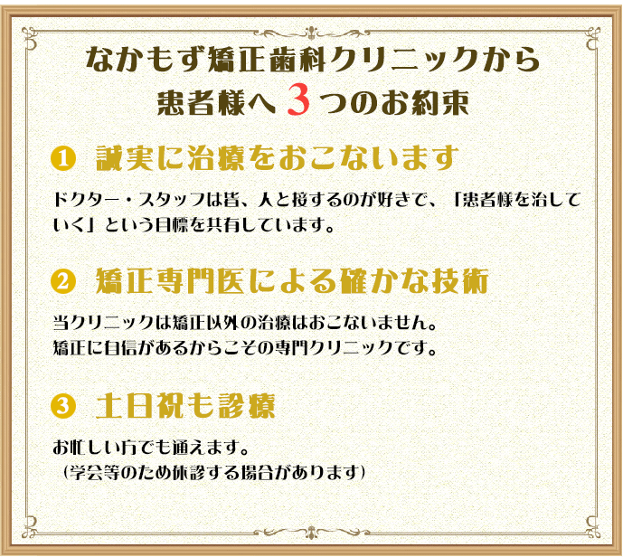 なかもず矯正歯科クリニックは、人との出会いを大切に、真心を込めて治療をおこないます。歯ならびがきれいになっていく様子を共に喜び、共に成長するクリニックにしたいと考えています。色々なかたに矯正治療を受けていただきたいと思っています。お支払方法についてもご相談ください。